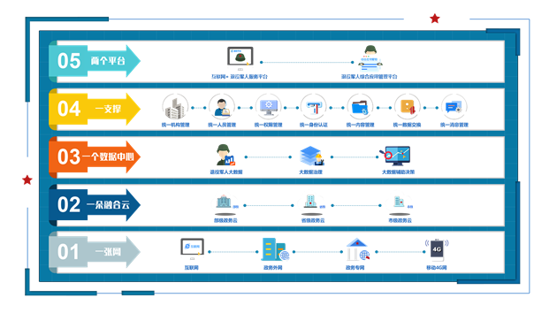 以政务外网为主干网,与互联网形成互联互通,以退役军人为服务对象,构建覆盖退役军人入伍、服役、退役、就业、优待五个阶段的业务应用体系;通过窗口、政务服务网、微信小程序、自助一体机等服务渠道为退役军人打造业务全面覆盖、需求主动感知、服务精准精细的智慧化服务网。