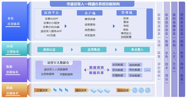 (2) 六层架构:从下至上依次为基础设施(依托政务云、互联网和电子政务外网)、数据资源(以省综合数据库为基础,建立数据共享机制)、应用支撑(扩展上级平台,实现系统互联互通)、业务应用(含单点登录、管理端与客户端)、接入服务(支持电脑、手机等多端接入)、用户对象(覆盖工作人员、退役军人、服务机构、社会公众)。