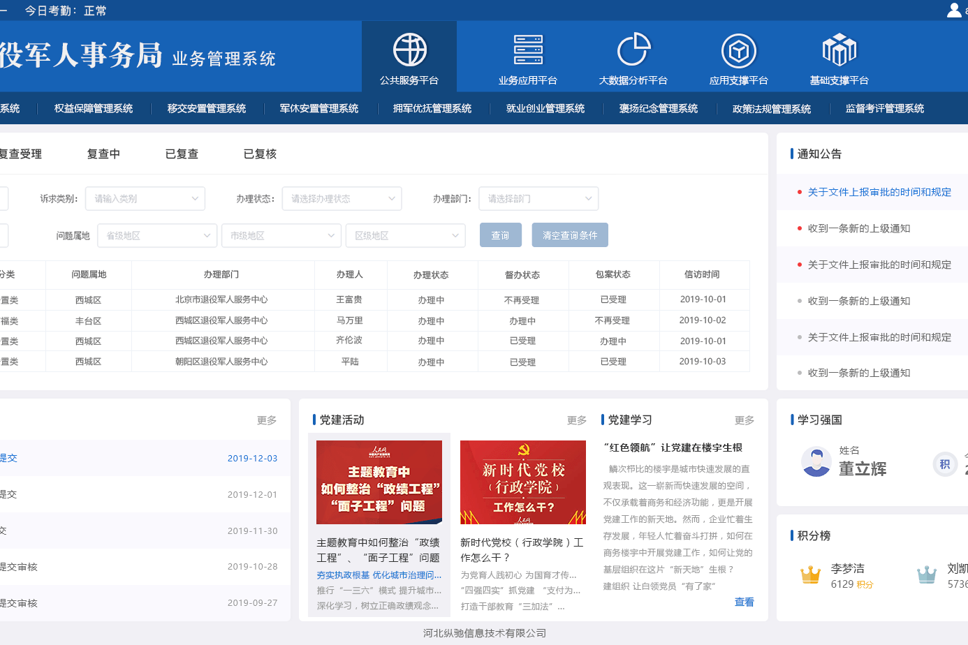在退役军人事务部平台基础上,围绕:思想政治与权益维护、移交安置、就业创业、军休服务、优待抚恤、褒扬纪念、舆情监控等业务,